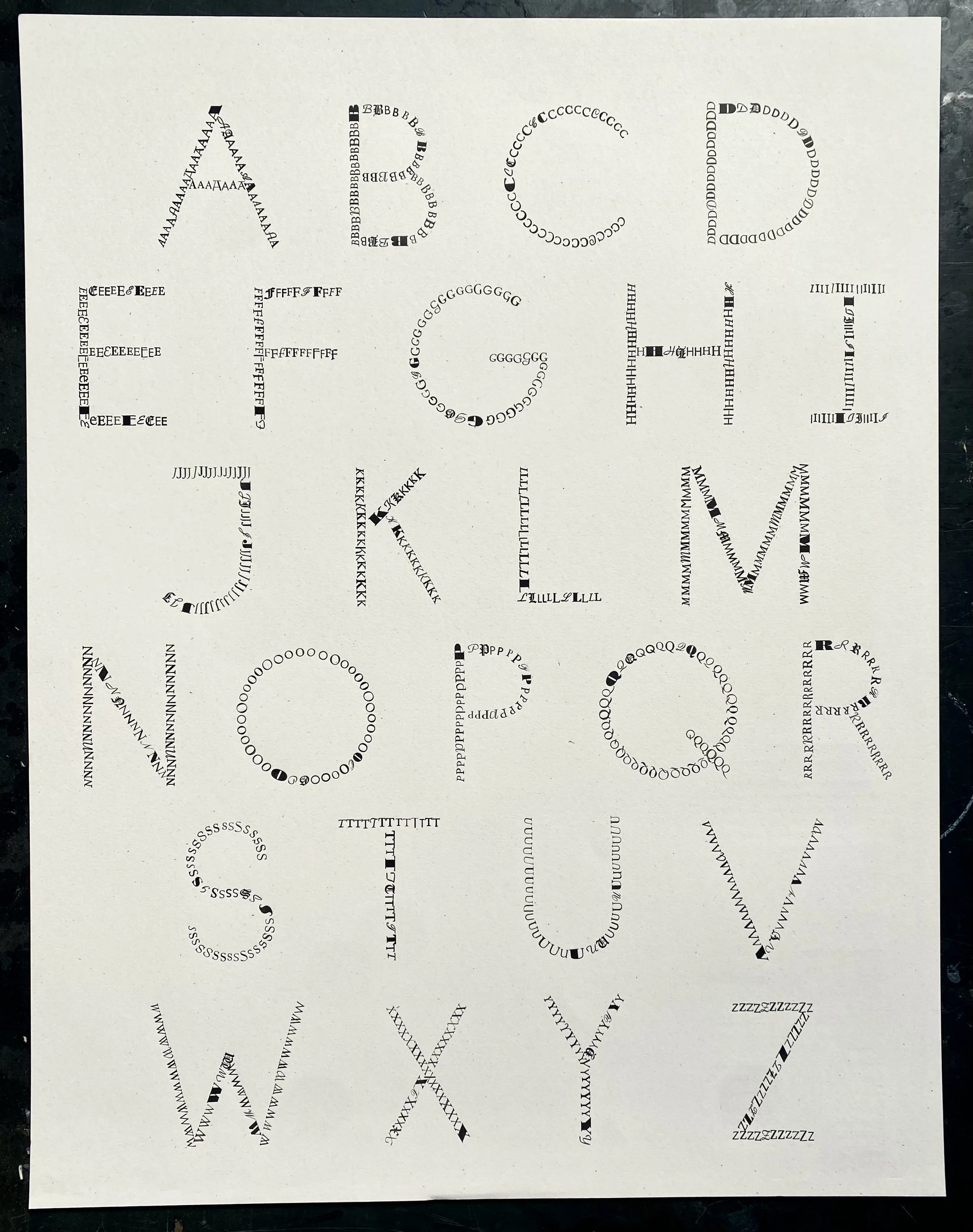 Letterpress printed poster of the latin alphabet. Handset with moveable metal type. Each letter is composed of 26 unique typefaces and was set using 18 pt metal type. The typefaces appear in alphabetical order within each letter. The curves and diagonals were printed using Daredevil furniture from Springtide Press. The colophon is printed on the back, shown below.